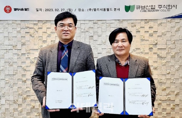 박종원 대표이사(왼쪽)와 문정희 큐브산업㈜ 대표가 계약서를 들고 기념촬영을 하고 있다.(사진=㈜엘리시움월드 제공)