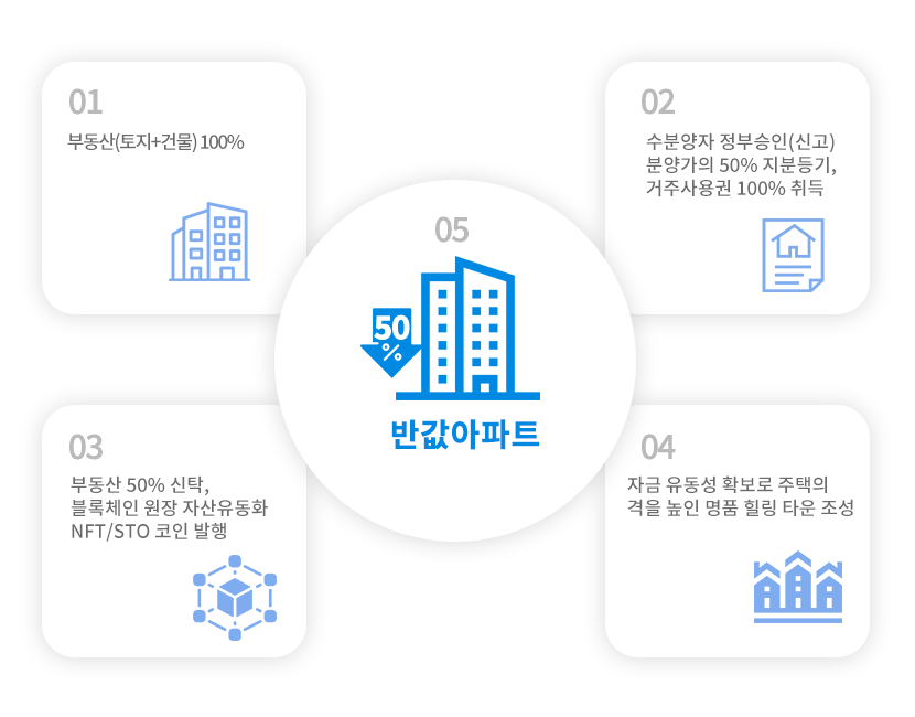 - 정부승인 분양가의 50%에 공급하며, 수분양자는 소유권(토지+건물) 50%를 지분 등기소유 하되 거주사용권은 100% 취득합니다.